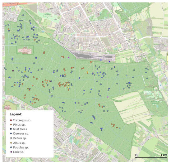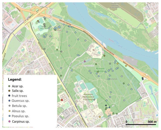 Location and species differentiation of defoliated trees in the Bielański Forest in Warsaw (Poland) (author’s elaboration based on the High Structural Diversity Tree Crown Map database [78]).