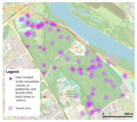 The risk map of the Bielański forest with hazard zones for ill trees (author’s elaboration based on the High Structural Diversity Tree Crown Map database [78]).