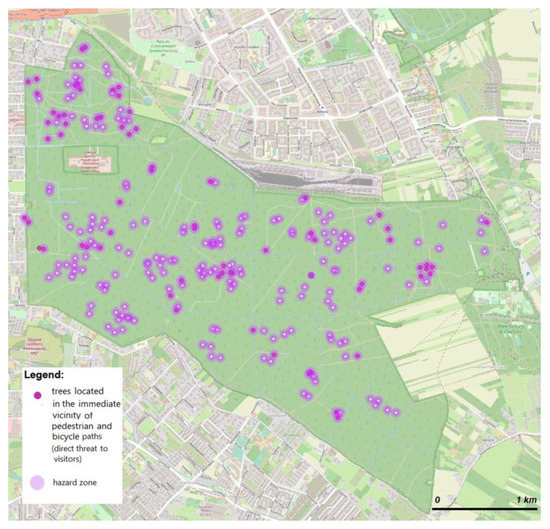 The risk map of the Kabacki Forest with hazard zones for ill trees (author’s elaboration based on Open Street Maps [76] and High Structural Diversity Tree Crown Map database [78]).