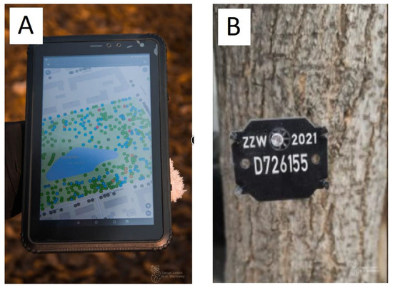 (A)—Example of prototype smartphone application with inventory and information of trees in given area in Warsaw city, (B)—Example of an inventory of trees of the area with numbering correlated with the mobile application (Photographs by Zarząd Zieleni Miejskiej w Warszawie) [81].