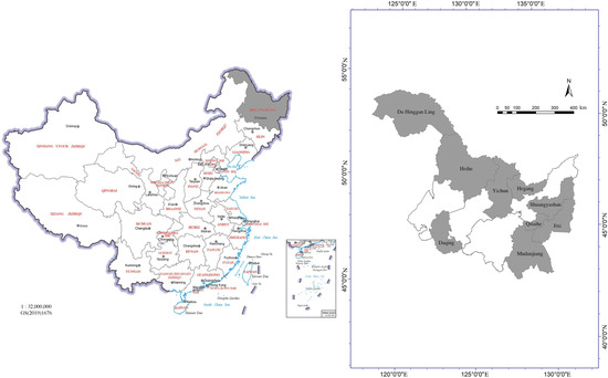 Heilongjiang Province, located in northeastern China (121°11′–135°05′ E, 43°26′–53°33′ N), is the most northerly, easterly, and highest latitude province in China. Heilongjiang Province is rich in mineral and forest resources and used to be an essential energy industrial base and one of China’s important coal and oil production areas. Based on the list of RBCs in China determined in “The National Sustainable Development Plan for Resource-Based Cities (2013–2020)” [29]. Nine prefecture-level cities in Heilongjiang Province were selected as the research regions. Mudanjiang, Hehe, Yichun, and DaHingganLing are forest-based cities; Jixi, Hegang, Shuangyashan, and Qitaihe are coal-based cities; and Daqing is a petroleum-based city (Figure 1).