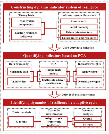 Based on CAS and resilience theory, this study specifies the resilience measurements of RBCs in Heilongjiang Province through a quantitative approach and identifies the resilience dynamics based on the adaptive cycle framework (Figure 2). Firstly, we construct a resilience indicator system based on the urban CAS components and established resilience studies from four aspects: governance, social economy, urban infrastructure, environment and resources. Secondly, we apply PCA to determine the indicator weights and calculate the resilience values of RBCs in Heilongjiang Province during 2010–2019. Finally, we apply cluster analysis to classify the grades of the resilience values, identify the resilience dynamics through the adaptive cycle framework and analyze them.