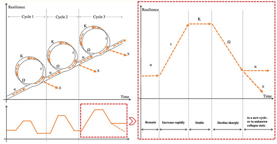 In addition, RBCs are affected by the finiteness and non-renewability of natural resources, and cities form distinct stages in their life cycles, i.e., development, maturity, decline, and transformation [25,26]. Established studies show a strong correlation between the RBCs’ life cycles and the adaptive cycles [1]. Specifically, when RBCs are in the r exploitation phase (development period), the development of non-renewable resources accumulates a large amount of capital, and the rapid accumulation of capital brings population growth, employment opportunities, and social welfare [27]. Urban resilience increases with redundancy and diversity. With the continuous accumulation of capital and resources, RBCs have entered the K conservation phase (maturity period), urban resilience is in a stable state. However, the solidified system reduces connectivity and flexibility. In addition, in parallel with economic and social development, conflicts between resource exploitation and the ecological environment, as well as urban construction and distribution of resource-based industries, have accumulated a high level of risk for RBCs. When subjected to external shocks, RBCs are unable to adapt to changes quickly, and the system rapidly enters the Ω release phase (decline period), with increased urban vulnerability and reduced resilience. At this point, when the system has resilience, it will gradually step out of the Ω release stage, begin to adapt and reorganize the structure and enter the α reorganization phase (transformation period). In the other case, the RBCs lack the resilience to resist, adapt, and recover, leaving them in a long-term Ω release phase. There is an urgent need for interventions to avoid a long-term collapse state and to help RBCs enter a new adaptive cycle. Conversely, RBCs leave the adaptive cycle, which leads to the urban system’s decay or to an unknown state [28].