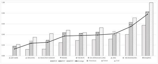 Figure 4 and Figure 5 show that the resilience values of the nine RBCs from 2010 to 2019 show an overall upward trend, with an average increase of 62.7% from 2010 to 2015 and a slower growth of 18% from 2015 to 2019. There are significant differences in resilience values among the nine RBCs. In the 10-year average resilience values, the highest is Daqing at 0.78, and the lowest is Qitaihe at 0.13, with a difference of nearly six times between the two cities. According to the above-mentioned interval of resilience values, Qitaihe has low resilience; Hegang and Shuangyashan have medium-low resilience; Jixi, DaHingganLing, Yichun, Hehe, and Mudanjiang have medium-high resilience; and there are no cities with high resilience. In addition, the differences in the resilience levels of RBCs are more related to their resource types, with the highest resilience level in the petroleum-based city (Daqing), followed by four forest-based cities (Mudanjiang, Hehe, Yichun, and DaHingganLing), and the lowest in coal-based cities (Jixi, Shuangyashan, Hegang, and Qitaihe).