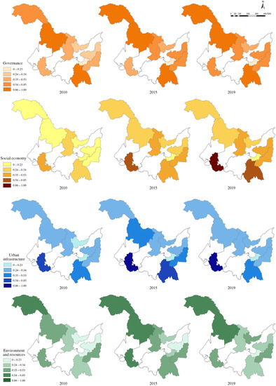 Figure 6 shows that the overall resilience values of RBCs in Heilongjiang Province are distributed into four groups. RBCs in the northwest group are DaHingganLing, Hehe, and Yichun; in the northeast group are Hegang, Shuangyashan, Qitaihe, and Jixi; in the southwest group is Daqing; and in the southeast group is Mudanjiang. The overall spatial distribution is high in the south and low in the north. From the spatial distribution of resilience values in different dimensions of RBCs (Figure 7), governance resilience is axially distributed, with RBCs on the northwest–southeast axis being higher than on the northeast–southwest axis, i.e., forest-based cities are higher than mining-based cities. The spatial variation of social economy resilience is obvious, showing a phased growth, and the spatial distribution is high in the south and low in the north. The spatial variation in urban infrastructure resilience rises from low to high and then falls back again, with the same spatial high in the south and low in the north. The spatial distribution of environment and resources resilience is high in the west and low in the east, which roughly corresponds with the spatial distribution of natural resources, with the northeastern part of Heilongjiang Province being a confluence of mountain ranges and more abundant resources.