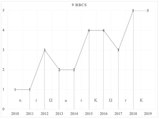 Based on the established studies [22,24], we used K-means cluster analysis to classify the resilience values of the nine RBCs during 2010–2019 into five grades and obtain interval values (Table 3). Furthermore, we applied the different characteristics of the four phases of the adaptive cycle to identify the dynamics of resilience during 2010–2019. The resilience measurement can be reflected in the adaptive dynamics of the urban system, and the adaptive cycle is the conceptual framework to describe the system’s adaptive dynamics [51,52,53]. Each adaptive cycle, in particular, is a four-phase transition process (r-K-Ω-α). In the r exploitation phase, the resilience tends to rise rapidly; in the K conservation phase, the resilience shows a stable state; in the Ω release phase, the resilience shows a short-term rapid decline; subsequently, after continuous adjustment or adaptation, the system will enter the α reorganization phase, presenting a relatively stable and slow upward trend. However, there are cases where the lack of urban resilience leads to the urban system’s decay or to an unknown X state. In addition, complex urban systems subject to external shocks and uncertainty events may not always follow the 4-phase cycle and may be missing or in one phase for a long time [11,54] (Figure 3). Eventually, the resilience dynamics of RBCs can be identified based on the characteristics of each adaptive cycle phase, combined with the rising, falling, and stable trends of resilience values of RBCs from 2010–2019.