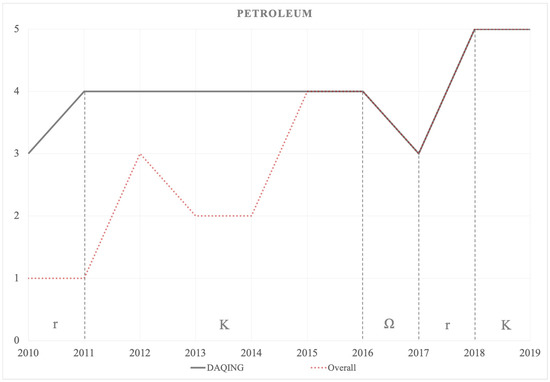 From Figure 9, the resilience dynamics of the petroleum-based city (Daqing) showed an overall stepwise growth trend and went through one adaptive cycle over ten years. After experiencing a rapid resilience growth r exploitation phase in 2010–2011; resilience entered a longer plateau period, i.e., the K conservation phase (2011–2016); and in 2017 resilience suddenly dropped into the Ω release phase; but then rapidly entered the r exploitation phase in 2018 and finally entered the K conservation phase again in 2019.