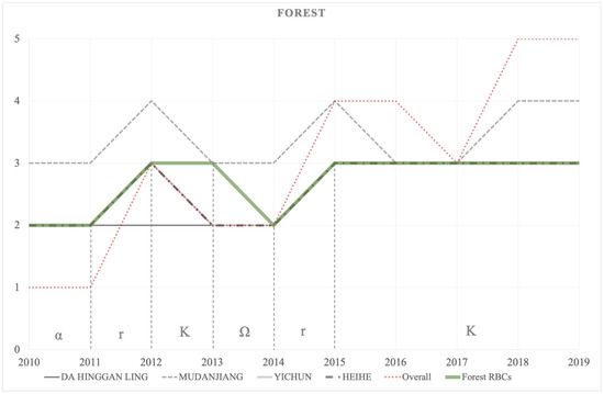 From Figure 10, the resilience dynamics of forest-based cities showed an overall smoothly fluctuating trend, experiencing a complete four-phase adaptive cycle (α-r-K-Ω) during 2010–2014. Subsequently, after the Ω release phase in 2014, the resilience rebounded to an upward r exploitation phase in 2015 and entered the longer-term stable K conservation phase in 2015–2019.