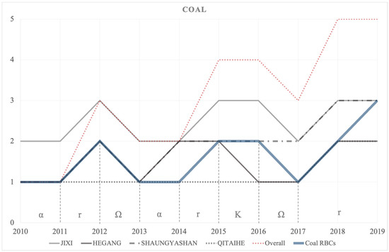 From Figure 11, the resilience dynamics of coal-based cities showed an overall fluctuating trend and underwent two adaptive cycles during the ten years. The first adaptive cycle (α-r-Ω) was during 2010–2013, followed by a second adaptive cycle (α-r-K-Ω) during 2013–2017, and then entered the r exploitation phase of rapid resilience improvement after 2017.