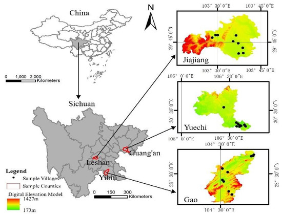The data used in this research are mainly from the National Natural Science Foundation of China. The research group conducted a random questionnaire survey on rice peasants in Jiajiang County, Gao County, and Yuechi County in Sichuan Province in July 2021. The survey method was a one-to-one, face-to-face semi-structured interview. The research content mainly involves the basic information of individual households of peasants, the situation of land transfer of peasants, the willingness and behavior of land transfer of peasants, and so on. According to the differences in regional economic development level, topography, and transportation convenience, three villages were selected from each district and county, three villages were selected from each township, and 20 peasants were selected from each village. A total of 540 questionnaires were obtained from 27 villages in 9 towns. As shown in Figure 2.