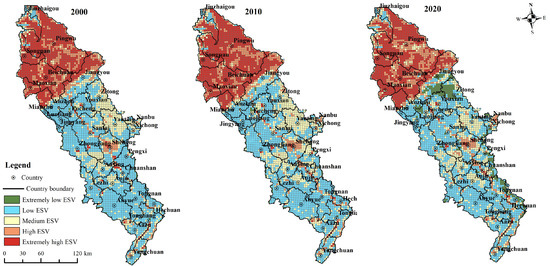 The total ESVs of the FJRB in 2000, 2010, and 2020 were 104,891.22 × 106, 105,032.38 × 106, and 105,032.08 × 106 yuan, respectively. From 2000 to 2020, the ESV of the FJRB showed a positive growth state (0.13% growth rate), and the total amount of ESV increased by 140.86 × 106 yuan. Using the natural break classification, the total ESV in the FJRB was divided into five categories (extremely low, low, medium, high, and extremely high). Table 3 and Figure 2 present the spatial patterns of the ESV from 2000 to 2020. Spatially, the ESV in the FJRB displayed a tendency that increased from southeast to northwest. Among them, the high-value zones are primarily found upstream of the FJRB in the northwest, such as Songpan, Pingwu, and Beichuan, and the highest values of ESV in 2000, 2010, and 2020 were 76.52 × 106, 68.80 × 106, and 75.02 × 106 yuan, respectively. The low-value areas are mainly located in the urban regions of the Fujiang River, such as Youxian, Jingyang, Luojiang, Anyue, and Tongnan.