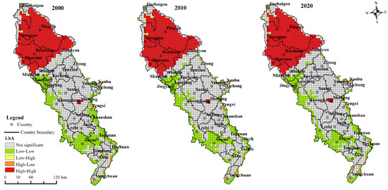 The LISA clustering chart from 2000 to 2020 (Figure 3) shows the low-low agglomeration of ESV in the midstream and downstream of the study region. These regions have a high level of urbanization and relatively concentrated construction land. The government has strengthened the construction and protection of Jiuhaigo, Xuebaodin, Wanglan, and other national nature reserves in the upstream region. The high-high ESV areas are concentrated in these regions. With the intensive production of non-agricultural industries, the lower-low areas of ESV in the northwest of Fucheng, Youxian, south of Anzhou, northwest of Luojiang, Zhongjiang, southwest of Lezhi, east of Pengxi, Anyue, and Tongnan gradually expanded along the urban development axis. The low-high and high-low ESV areas did not change substantially.