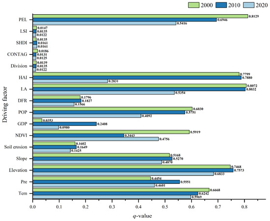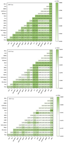 The OPGD model was utilized to calculate the driving forces underlying the spatial differentiation of the ESVs in the FJRB from 2000 to 2020 (Figure 4). The spatial differences of the distribution of ESVs in the FJRB were influenced by natural, human-social, and landscape factors. Among them, the spatial variation of ESV in the FJRB in 2000 was most significantly influenced by PEL, HAI, LA, and elevation, all with q-values > 0.74. In 2010, the contributions of factors such as LA, HAL, elevation, PEL, and Tem were less than those in 2000, all with q-values > 0.62. In 2020, the elevation had the biggest contribution to the spatial heterogeneity of ESV in the FJRB, with a q-value of 0.6833. This was followed by a reduced contribution of Tem, PEL, and LA, all with q-values > 0.50. The influencing factors with the highest contribution during 2000–2020 were elevation, PEL, LA, and HAI, with a high explanatory power (q-values > 65%) and significant influence. Second, the influences of POP, Pre, Slope, and NDVI were approximately 40–60%, which are key factors influencing the spatial differentiation of ESVs within the research area. In addition, both the DFR and the effect of soil erosion were greater than 15%, which are minor factors of importance affecting the spatial variation of ESV in the watershed. Finally, the explanatory power of factors such as GDP, LSI, SHDI, DIVISION, and CONTAG was below 10%.