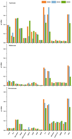Geographical detection q-values of ESVs in the upstream, midstream, and downstream of the FJRB in 2000, 2010, and 2020.