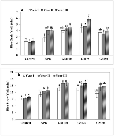 The results obtained from the three-year experiment showed a higher significant difference in rice grain yield (t ha−1), as mentioned in Figure 1a, in treatment with 75% of recommended NPK synthetic fertilizers with GM incorporation as compared to control, where no additional amendment was applied. Interestingly, a significantly lower rice yield was obtained in control for three consecutive years compared to the other treatments. No significant difference in grain rice yield was recorded between the consecutive three years in treatment where 75% of chemical recommended fertilizers were applied combined with GM incorporation. No significant improvement in rice grain yield was recorded in any treatment for three consecutive years, but a significant difference was recorded among the various treatment means after the application of various rates of chemical fertilizers and GM incorporation into the soil.