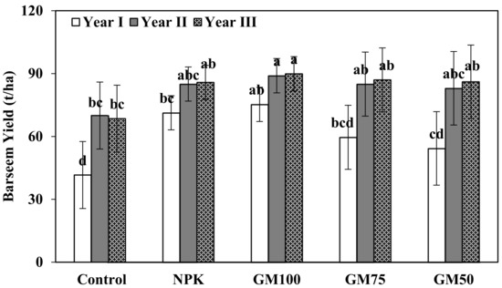 The berseem yield on a per-year basis obtained during three years of experimentation was affected by various rates of chemical fertilizers and GM application, as mentioned in Figure 2. A significant improvement in berseem yield was recorded in the second and third years as compared to the first year in control. Similarly, the berseem biomass was significantly improved in the third year over the first year in the treatment where 50% of chemical fertilizers combined with GM application were performed. However, higher significant berseem yield was obtained in the second and third years, where 100% of chemical fertilizers combined with GM application was conducted, compared to three consecutive years of control, first year of sole chemical fertilizers application, first year of 75% of recommended synthetic fertilizers combined with GM application, and first year of 50% of chemical fertilizers combined with GM application.