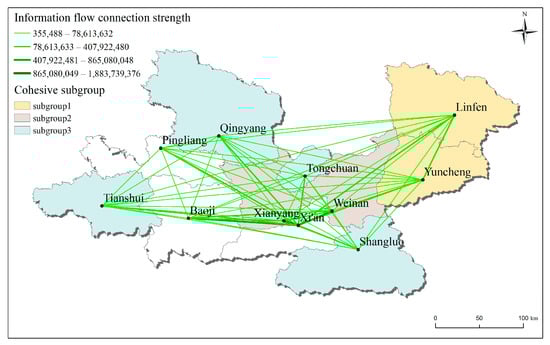 There are three cohesive subgroups in the information flow network. Subgroup 1 includes Linfen and Yuncheng in Shanxi Province, although the total amount of information flow is at the fourth level. The connection strength of Yuncheng–Linfen is second only to Xi’an–Other Cities, Baoji–Xianyang, and Xianyang–Weinan, and the information connection between the two cities in subgroup 1 is very close. Subgroup 2 includes Xianyang and Weinan in Shaanxi Province. The total amount of information flow in the two cities is relatively strong, and they are located at the second and third levels, respectively. The strength of information flow connection between Xianyang and Weinan also ranks at the forefront. Subgroup 3 includes Shangluo and Tongchuan in Shaanxi Province and Tianshui and Qingyang in Gansu Province. Although this subgroup includes four cities, the total information flow of cities and the strength of the information flow connection between cities are relatively weak.