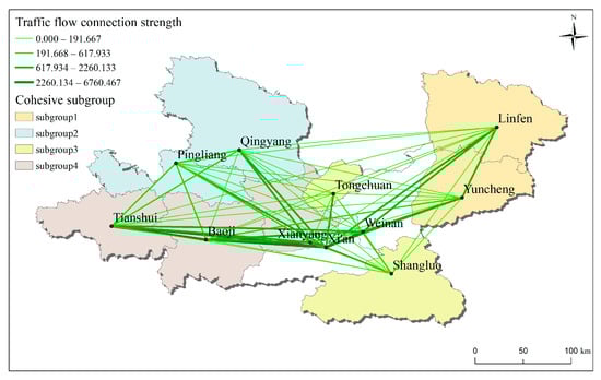 There are four cohesive subgroups of traffic flow. Subgroup 1 is Yuncheng and Linfen, which both belong to the southwestern part of Shanxi Province. Although the total traffic flow in the cities is relatively weak, the traffic flow connection between Yuncheng and Linfen is relatively strong. Subgroup 2 includes Qingyang and Pingliang. Both Qingyang and Pingliang belong to Gansu Province. Since Pingliang has not yet opened high-speed rails, it lags behind Qingyang in terms of total traffic flow, and the traffic flow connection between Qingyang and Pingliang is relatively weak. Subgroup 3 includes Shangluo and Tongchuan in Shaanxi Province, and Shangluo and Tongchuan are ranked at the end of the total traffic flow and connection strength. Subgroup 4 is Tianshui, Baoji, and Xianyang. The total traffic flow of the three cities is relatively strong, and the traffic flow connection between cities is at the first and second levels.