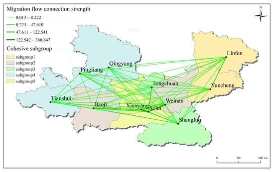 Subgroup 1 is Yuncheng and Linfen in Shanxi Province, and subgroup 4 is Qingyang, Pingliang, and Tianshui in Gansu Province. The total amount of urban migration flow in these two subgroups is at the fourth level with more migration connections between cities within the subgroups and fewer connections with cities outside the subgroups. Subgroups 2, 3, and 5 are all cities in Shaanxi Province; subgroup 2 is Weinan and Baoji; subgroup 3 is Shangluo and Tongchuan; and subgroup 5 is Xi’an and Xianyang. Xianyang is bigger than Weinan, and Baoji is bigger than Shangluo and Tongchuan, which reflects the migration and flow of population between three types of cities with different development conditions.