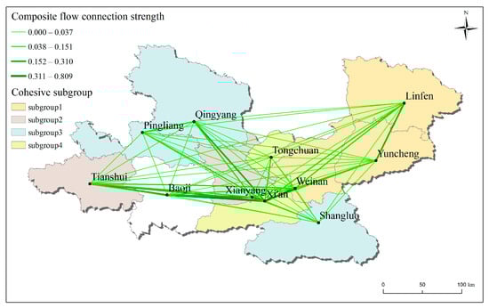 Spatial connection pattern of composite flow and analysis results of cohesive subgroups.
