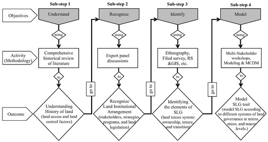 Sub-Step 2: Recognizing land-based administrative arrangements: The manner in which various institutional structures have been consolidated by governments or decentralized by indigenous people should be identified at this point. This clarifies the landowners’ contribution to land rights and the shared awareness and collective expectations of land users in society [30]. This method clarifies how such structures have been socially developed by the creation of a multi-stakeholder forum, for which the positions of stakeholders, strategies, programs, and land legislation have been examined.