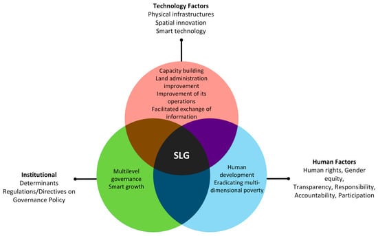 Previous efforts such as the studies by Berge et al. [103], Chamberlain and Anseeuw [104], Duveiller et al. [105], Jombo et al. [106], Musakwa [107], Pasura [108], and Pritchard [109] show the value of blurring the distinction between the design of land use reform laws and the implementation of these laws to encourage policy-makers in the field of land use to use the new knowledge and understanding of this process. For example, Nuhu [110] showed that in Tanzania and other developing countries, peri-urban land governance is formed by the divergent or complementary positions of players arising from their jurisdiction, influence, and interest, which establish a dynamic relationship that affects the mechanism of land governance. Recognizing the role of different actors is therefore crucial not only in enhancing relations among actors to strengthen the administration of peri-urban land, but also in the introduction of appropriate legislative and administrative mechanisms to regularize both formal and informal actors. Stevens, Greif, and Bouma [36] argued that while global supply chains facilitate economic growth and poverty alleviation, they also exert adverse impacts, including accelerating tropical deforestation. Thus, in order to encourage positive outcomes from large-scale land acquisition NGOs, foreign institutions and stakeholders have encouraged businesses to willingly implement responsible policies towards land. Good governance is one of the management models in the public sector that facilitates decision-making and assists the government in performing its legal duties [111]. As a result, there is a need for a smart approach that purposefully includes land reform champions, gatekeepers, and challengers and applies continuous information and outreach strategies to enable adaptation to different socio-economic, political, and environmental contexts. Accordingly, it is proposed that SLG is able to promote shared growth and solve many land sector problems by considering all principles of good land governance. Governance should be focused on the intelligent sharing of knowledge flows among its various subsystems. The sharing of knowledge is focused on a clever policy-making system structured for connecting users and data across multiple domains, as well as sharing information.