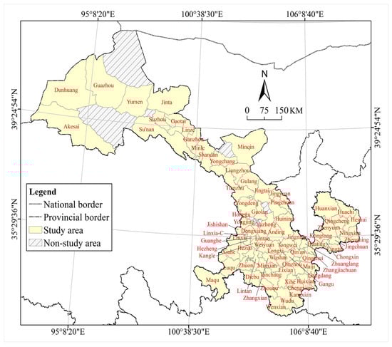 Gansu Province is in northwestern China and is a less developed region (Figure 1). The study area covers 79 county-level administrative districts in Gansu Province, excluding Chengguan, Qilihe, Xigu and Anning districts in Lanzhou City, Jiayuguan City (which has no subordinate districts or counties), Jinchuan District in Jinchang City, Baiyin District in Baiyin City and Subei County in Jiuquan City (Figure 2). Eight units are excluded from the study area because of the data deficiencies. In the Index of Digital Rural Counties, 2020, data are only available for counties where the ratio of agricultural value added to GDP was less than 3% in 2019, excluding data for prefecture-level cities.