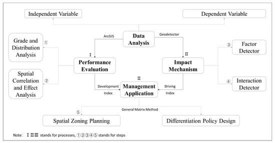 The digital village strategy has achieved much after years of implementation, but it also faces great challenges. To accommodate the new development situation, there is an urgent need to optimize the digital village policy. However, there is still a lack of basic and critical knowledge on the level of digital village construction, regional differences and impact mechanisms to provide an adequate basis for the government. Using the Geographic Information System (GIS) and GeoDetector, this paper is dedicated to an empirical study on 79 counties in Gansu, China (including all national digital village pilots in the province) to analyze the level of digital development of villages and the characteristics of regional differences, reveal the influence factors and their mechanisms of action and provide references for the construction of digital or smart villages in China and similar countries around the world. After data collection and preprocessing (as detailed in Section 2.3), the study consists of three processes and five steps (Figure 3).