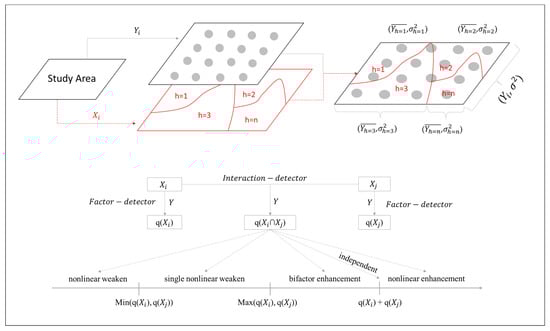 The second process is to analyze the mechanisms driving the development of digital villages based on the GeoDetector. What factors have influenced the process of the digital and intelligent development of the countryside? GeoDetector is used to quantify the influence of different factors on rural digitization and reveal the interaction and effect between different factors. The analysis of the driving mechanism can be conducted based on GeoDetector [], Geographically Weighted Regression [], the Spatial Durbin Model [] and other methods. GeoDetector is used in this paper, as it allows simultaneous analysis of the direct and interactive effects of the influence factors and fits the needs of this study better than other methods. GeoDetector is a collection of open-source research applications developed by Prof. Wang Jinfeng for measuring spatial heterogeneity, detecting explanatory factors and analyzing interactions between variables (including two versions in Excel and R languages, free to download at http://www.geodetector.cn/, accessed on 12 October 2022) that has been applied in many fields of natural and social sciences. The basic principle of GeoDetector is based on the second law of geography (the Law of Spatial Heterogeneity). It divides the study area into geographic subdivisions in calculation and defines the variance of the digital rural development index within a subdivision smaller than that between subdivisions as spatial stratified heterogeneity.