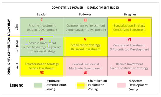 The third process is to divide the study area into multiple spatial zones and design differentiated management policies by using the general matrix method. How to apply the analysis results to the design process of digital rural development policy? The results of the analysis of the first two problems are coupled using the GE matrix to provide ideas and suggestions for policy design from the perspective of spatial zoning and differentiated management. The last step is to divide the study area into a variety of space partitions by the general matrix method and design targeted and adaptive management policies for each partition. The general matrix method, also known as the nine-quadrant evaluation method, is a portfolio analysis method designed by the General Electric Company in the United States. It evaluates the competitiveness and attractiveness of companies separately based on weighted indices to establish nine combinations and three strategy types. In the study of village digitalization, the development index is chosen to represent the competitive power as the horizontal coordinate, and the driving index is chosen to represent the attractiveness power as the vertical coordinate. The two indices are divided into three levels by the quantile method, thus contributing to nine combinations and three types of policy areas. Targeted and appropriate investment strategies and management policies are designed for each type based on the actual construction and development needs of the digital villages in the policy area (Figure 5).