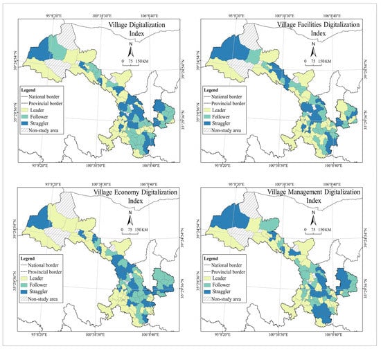 Linxia had the largest village facilities digitalization index, up to 96.06, while Maqu had the smallest value, only 34.65, differing from the minimum by 2.77 times. The mean value was 67.31, much higher than the village digitalization index, and 51.90% of counties were above the mean. Linxia, Yongdeng, Chongxin, Dunhuang, Gaolan, Yuzhong, Lintao, Liangdang and Honggu are leaders in the digital development of rural facilities in Gansu Province, mostly clustered in the Lanzhou metropolitan area, Tianshui–Longnan metropolitan area and the Hexi Corridor town belt in clusters. Suzhou, Xihe, Jingtai, Longxi, Huining, Jingchuan, Qingcheng, Lingtai, Yumen, Liangzhou, Guanghe, Zhuanglang, Zhengning, Yongchang, Gangu and Qingshui are followers in the digital development of rural facilities, forming four clusters in Dingxi, Jiayuguan, Qingyang and Wuwei. Zhangjiachuan, Minqin, Linxia, Xiahe, Diebu, Dongxiang, Akesai, Luqu and Maqu are stragglers in the digital development of rural facilities, mostly concentrated in the Gannan Tibetan Autonomous Prefecture (Figure 6). In the national pilot project, Gaolan of Lanzhou City and Gaotai of Zhangye City are leaders. In particular, Gaolan ranks fifth and has played a good demonstration role. Yumen of Jiuquan City is a follower, ranking 42nd, and its village facilities digitalization index is only 67.20, still below the average, with a big gap with the predetermined target of the central and provincial governments.