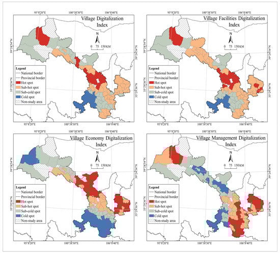 Unlike the village digitalization index and the village facilities digitalization index, the village economy digitalization index forms two hot and cold spot centers, respectively. The big hot spot center is located in the Jinchang–Wuwei metropolitan area, with sub-hot counties expanding to Lanzhou. The small hot spot center is in the Qingyang–Pingliang metropolitan area. The small and large hot spot centers are connected through the sub-hot spot area. The large cold spot is located in the Gannan–Longnan region, while the sub-cold spots are distributed in a band on its north side. The small cold spot center is located in the Jiuquan–Zhangye region, distributed in a ring-like cluster.