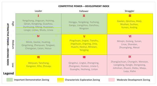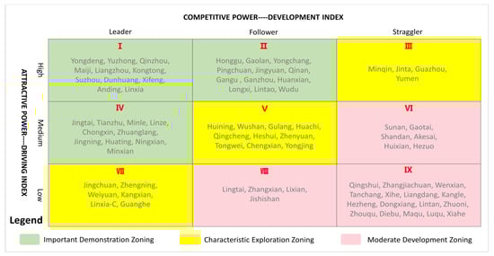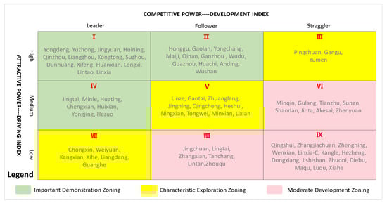 In this study, the policy partitions are delineated by the general matrix method, where the horizontal coordinates are directly based on the analysis results in Figure 6, while the vertical coordinates are weighted to calculate the driving index. The direct influence (set to zero when not statistically significant) and the interactive influence are given the same weight in the calculation. Table 2 and Table 7 are summed up, and then the proportion of each factor is calculated as the weight. Taking the village digitalization index as an example, the direct and interactive influences of ~ are shown in the first column of Table 2 and Table 7, corresponding to the total influences of 0.64 (0.21 + 0.43), 0.48 (0.11 + 0.37), …, 0.49 (0 + 0.49), 0.65 (0.39 + 0.26), with a sum of 5.72, corresponding to weights of 0.11 (0.64/5.72), 0.08 (0.48/5.72), …, 0.09 (0.49/5.72) and 0.11 (0.65/5.72), respectively. For each county, the weighted sum of all impact factors is calculated as the driving index, and quantile clustering is performed for all counties in the study area. By interacting the horizontal and vertical coordinates, all counties in the study area are classified into nine subcategories (combinations) and three categories.