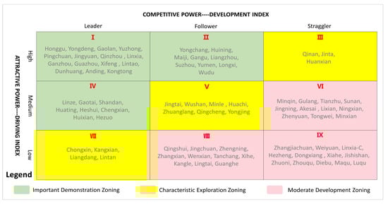 This section deals with the third question (how to apply the analysis results to the design process of digital rural development policy) using the GE matrix. To provide a quantitative basis for spatial planning zoning, the 79 counties in the province are classified into nine sub-categories (combinations) and three categories by hierarchical classification (quantile clustering) in the GE matrix, using the development index and the driving index as the horizontal and vertical axes, respectively. According to the national and Gansu digital village construction policies, differentiated policies are designed for the three categories of planning zones based on the rural digital development needs of the study area.
