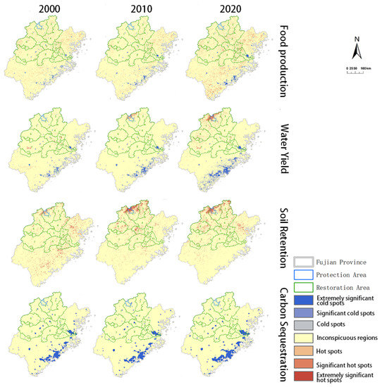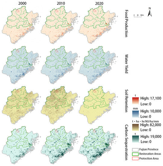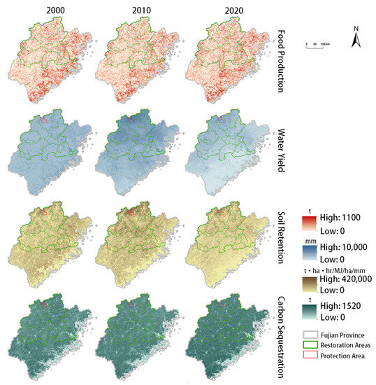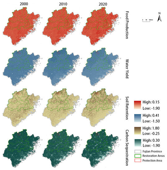 From 2000 to 2020, the supply of FP and CS increased, and WY and SR decreased in the Fujian Province (Table 3). The FP in each region decreased between 2000 and 2010 and increased between 2010 and 2020, with the largest changes in protected areas occurring during these two time periods. CS in the protection area decreased from 2000 to 2010 and increased in the other regions in both time periods. SR services showed an increasing and then decreasing trend in both protection and restoration areas, while they continued to decrease in other areas. The change rate was greatest in protected areas in these two time periods.