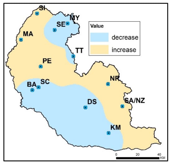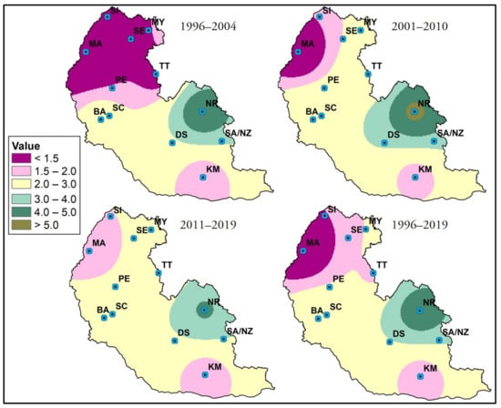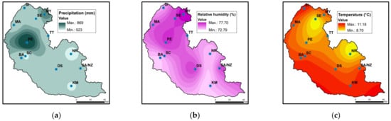 The spatial distribution and variation of P within the study area show a significant discrepancy, with Pmeanmaxa of 869 mm (PE) and Pmeanmina of 523 mm (NR, KM, SC) (Figure 2a). The ra value oscillated during the year between 68 and 86%, with the lowest values in April–August and the highest in November–January. The spatial and temporal variation ranged from 72.1% (BA) to 77.78% (MY), with a minimum in 2003 (70.2%) and a maximum in 1966 (78.4%) (Figure 2b). Tmeanmin occurred in 2007 at SE station, which is also the MS with the lowest Tmeanmin (8.7 °C). Tmeanmax occurred at all stations within the last 7 years of the study period (2015–2019), with the highest (14.09 °C) at MY station. Tmeanmax occurred at SI (11.18 °C). The warmest months were May–September, accounting for 12–18% of Tmeanmax (Figure 2c).