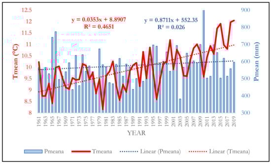Tmeana in the area shows a noticeable rise of +1.75 °C (R2 = 0.47) for the whole study period (1961–2019) (Figure 3). In the 1960s, Tmeana was 9.34 °C, but after 2010, it reached 11.09 °C. Although Tmeana fluctuated over the years, an overall positive trend can be identified even within decades. The first decade (1961–1969) is characterized by a 0.19 °C increase and the last one (2000–2019) by a 0.66 °C increase. Pmean shows a slightly increasing trend. The first three decades show a decreasing trend of up to −4.6%, but in the last two decades (2001–2010 and 2011–2019) the precipitation amount increased to +6.63% and +6.53%, respectively.