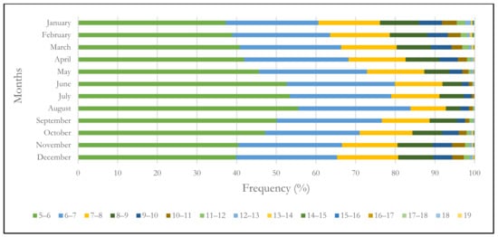 It was found that with regard to total wind occurrence (calculated from daily 7 AM, 2 PM, and 9 PM measurements) Umean values of <5, 5–6, 6–7, 7–8, and 8–9 m/s accounted for 87, 5.7, 3.4, 1.8, and 1%, respectively. Umean > 9 m/s accounted for less than 0.5%. Frequent Uer occurred mostly in spring (March, April) and autumn (October, November). Uer occurrence was less frequent in summer (July, August) (Figure 6).