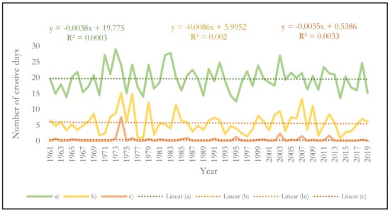 To clarify the fluctuation of Wf, an analysis of Uer occurrence was performed based on the following scenarios: (a) Pmax < 0.1 mm within 5–10 days and Umean > 5 m/s; (b) Pmax < 0.1 mm within 10–19 days and Umean > 5 m/s; and (c) Pmax < 0.1 mm for >20 days and Umean > 5 m/s (Figure 7). The data show no significant change in the trend line in any of the analyzed scenarios during the study period. The mean number of days per year with Uer (Duer) in scenario a varies between 17.63 in 1961–1970 and 21.22 in 1971–1980, and 19.16 in the last decade. In scenario b, Duer varies from 4.91 in the last decade to 7.13 in 1971–1980, and in scenario c values vary between 0.17 in 1961–1970 and 1.02 in 1971–1980, and 0.3 in the last decade.