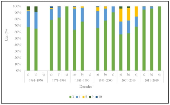 The analysis of the frequency of Uer occurrence in months with possible wind erosion occurrence in Slovakia across the decades shows that in the last decade, Uer occurred in March 95, 97, and 100% of the time in scenarios a, b, and c, respectively (Figure 8). However, the previous decade (2001–2010) showed different results. Erosive winds occurred 57, 20, and 20% of the time in March, April, and May, respectively. The ratio between spring and autumn Uer occurrence was 98:2 during the whole study period.