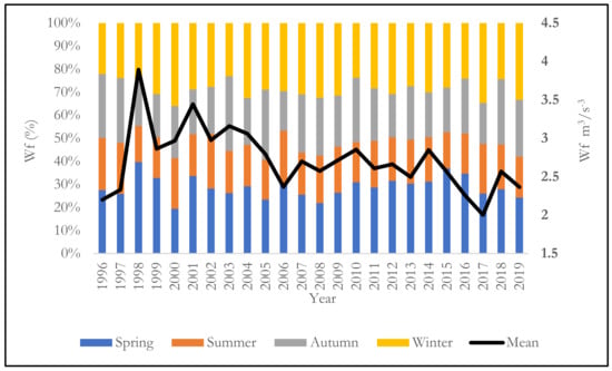 The seasonal and temporal variability of Wf (Figure 9) varied significantly between 1996 and 2006. Wf showed an increasing trend in the first two decades by +11.86% and +3.66% and a decreasing trend during the last decade by −8.49%. The highest Wf (3.14 m3/s−3) was found for spring, and the lowest for summer (2.07 m3/s−3).