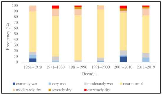 SPI, the most widely adopted and recognized parameter for characterizing meteorological drought, was described in [55] for various time periods (1, 3, 6, 12, 24, and 48 months) [56]. Meteorological drought monitoring (MDM) software was developed in [57] to count and analyze drought with a high cross-correlation coefficient (R2 > 0.90). In this study, we calculated monthly and yearly SPI from the datasets of 12 MSs. The SPI index was classified into 7 categories: >2, extremely wet; 1.5 to 1.99, very wet; 1.0 to 1.49, moderately wet; −0.99 to 0.99, near normal; −1.0 to −1.49, moderately dry; −1.5 to −1.99, severely dry; and ˂−2, extremely dry.