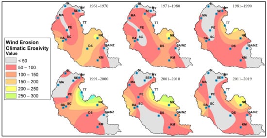 - Yue, S.; Yang, R.; Yan, Y.; Yang, Z.; Wang, D. Spatial and temporal variations of wind erosion climatic erosivity in the farming-pastoral zone of Northern China. Theor. Appl. Climatol. 2019, 135, 1339–1348. [Google Scholar] [CrossRef]