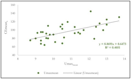 CEmeana (for the whole study region) ranged from 58.4 to 171.31, with an average of 98. SD varied over years between 34 and 119, which also confirms high temporal fluctuation. CEmeana fluctuated until 1973, after which it rapidly decreased until 1987, when it went above average again. A similar shift occurred between 2012 and 2016, when the value decreased to a minimum value again. This trend also correlates well with Umaxmean (Figure 15). The evaluation of the total monitored period shows a slight decreasing trend of CEmeana, but with no great significance.