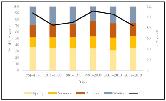 The decadal analysis of seasonal periods did not show high variation during the study period. The proportion of Uer in the four seasons was 26, 21, 25, and 28%, with CV ranging from 5.9% (spring) to 9.1% (winter).