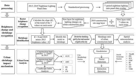 This study used nighttime light data from 2013–2019 to identify urban shrinkage and landscape pattern analysis, in order to analyze the morphological characteristics of construction land in China. The degree of urban shrinkage was included as the dependent variable, while urban form and socio-economic factors were the independent variables. By entering the variables in Geodetector, the study explored the influence of urban form and socio-economic factors on urban shrinkage and conducted interaction analysis. The following conclusions were drawn: