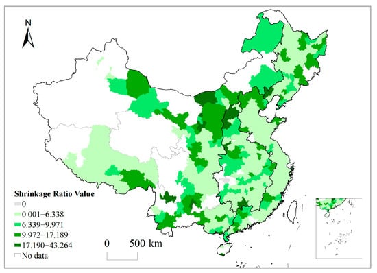 (1) The cities showed varying degrees of shrinkage, with a more significant proportion of shrinkage in the more underdeveloped cities in the central and western regions. A generally higher proportion of shrinkage was observed in the northeast and central regions, while a relatively lower degree was found in the eastern region. Both western and eastern regions largely differ in the degree of shrinkage. Based on autocorrelation analysis, the spatial distribution of urban shrinkage in China has significant clustering characteristics, with low–low clustering in the eastern coastal region and high–high clustering in northern and southwestern regions.
