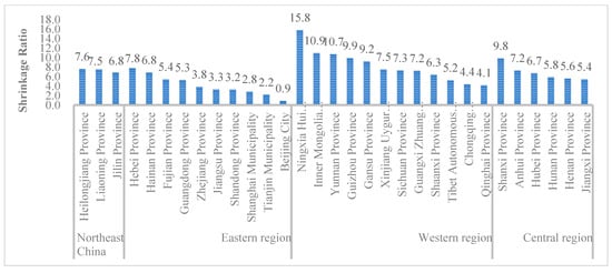 The provinces with more significant degrees of shrinkage were concentrated in the underdeveloped provinces and autonomous central and western regions (Figure 4). Among them, the Ningxia Hui Autonomous Region had the most significant degree of shrinkage (15.8), followed by the Inner Mongolia Autonomous Region (10.9), Yunnan Province (10.7), Guizhou Province (9.9), Shanxi Province (9.8), and Gansu Province (9.2). It can be observed that four of the top five provinces with the highest degree of shrinkage belonged to the western region of China. The five provinces (municipalities directly under the central government) with the most minor shrinkage belonged to the eastern region, including the municipalities of Shanghai (2.802), Tianjin (2.160), and Beijing (0.864). Overall, all provinces showed varying degrees of shrinkage, with the most severe shrinkage (Ningxia, 15.8) being about 17 times greater than the least severe one (municipality directly under the central government—Beijing, 0.9).