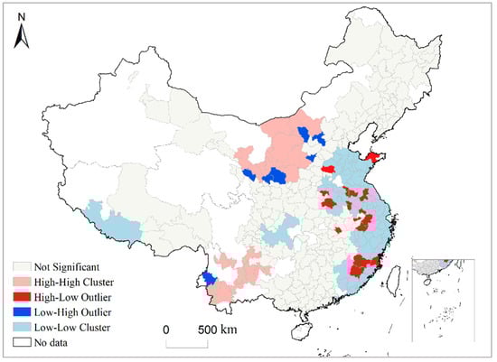 The spatial autocorrelation analysis of the shrinkage of each city resulted in Moran’s Ⅰ value of 0.1928 and Z value of 9.4334, which passed the significance test at the 0.01 level. This indicates a significant positive correlation in the spatial distribution of urban shrinkage in China. The results of the analysis of local spatial autocorrelation (Figure 5) indicate that the spatial distribution of shrinkage shows clustering characteristics, with low–low clustering in the eastern coastal region and high–high clustering in the northern and southwestern regions.