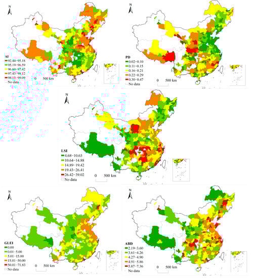 This study explored the influence of urban form on urban shrinkage, and the influence of combined urban form and socio-economic factors on urban shrinkage. Firstly, the study conducted spatial pattern analysis of AI, PD, and LSI indexes based on construction land patches in 2019. The results are shown in Figure 6. The AI and PD indexes showed obvious north-to-south differences in the eastern region, with the Qinling Mountains and the Huaihe River as the boundary. The AI index was higher and the PD was lower north of the boundary, indicating that the aggregation of construction land in northern China was higher, the degree of connectivity was more remarkable, and the degree of fragmentation was lower. However, south of the boundary, the situation was the opposite because the LSI index was higher. In other words, the construction land patches in this region were more scattered. Furthermore, GLEI had higher agglomeration values in the coastal areas north of the Beijing–Tianjin–Hebei and Yangtze River Delta urban agglomerations, and lower values in the rest of the region. However, GLEI values were generally low in the 293 cities, which indicated that urban expansion from 2013 to 2019 was dominated by inefficient expansion. In addition, the GLEI values showed a decreasing feature from coastal to inland. The ABD index showed no noticeable agglomeration effect in spatial distribution, except in the Tibetan, northern Heilongjiang regions, and parts of the Central Plains, where it was lower.